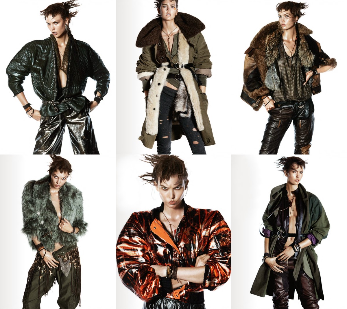 Tom Boy, the session, which made photo David Sims, and execution took up Emmanuelle Alt. At the outset, I must say that the session is not in my taste. I do not like such a large amount of clothes, like different shapes and contrasting textures at once. As for me; No! The two most highlighted in this session, things are shiny texture and references to animals. My favorite look in this session is the one with a large jacket from Diesel and pants with holes from Chanel.